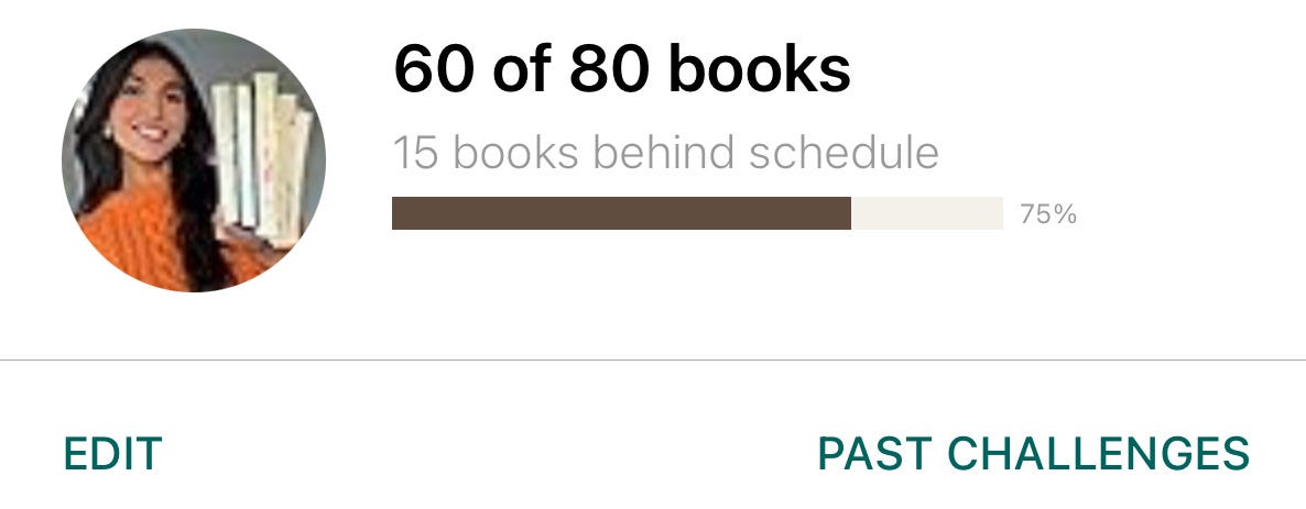 I also set an 80 book goal this year and fell short. My goal for 2025 is to try and make it through the longer classics. I’ve never read Victor Hugo for example. It’ll help improve my writing too. Great post!